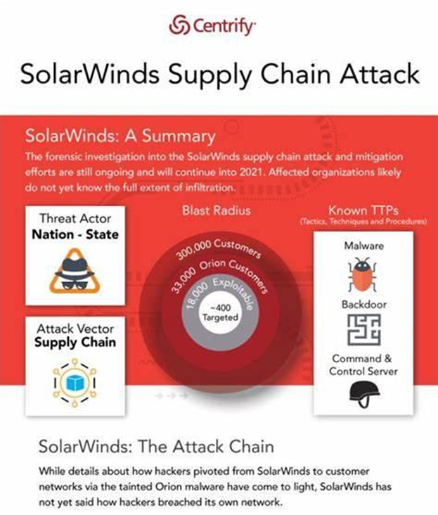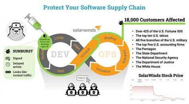 Contoh terbaik dari hal ini adalah serangan siber SolarWinds, yang juga dikenal sebagai serangan SUNBURST, adalah serangan rantai pasokan canggih yang terjadi pada tahun 2020. Serangan ini dilakukan oleh kelompok negara yang diyakini berbasis di Rusia dan melibatkan penyisipan kode berbahaya ke dalam pembaruan perangkat lunak platform SolarWinds Orion, perangkat lunak manajemen TI populer yang digunakan oleh banyak organisasi, termasuk lembaga pemerintah dan perusahaan swasta.